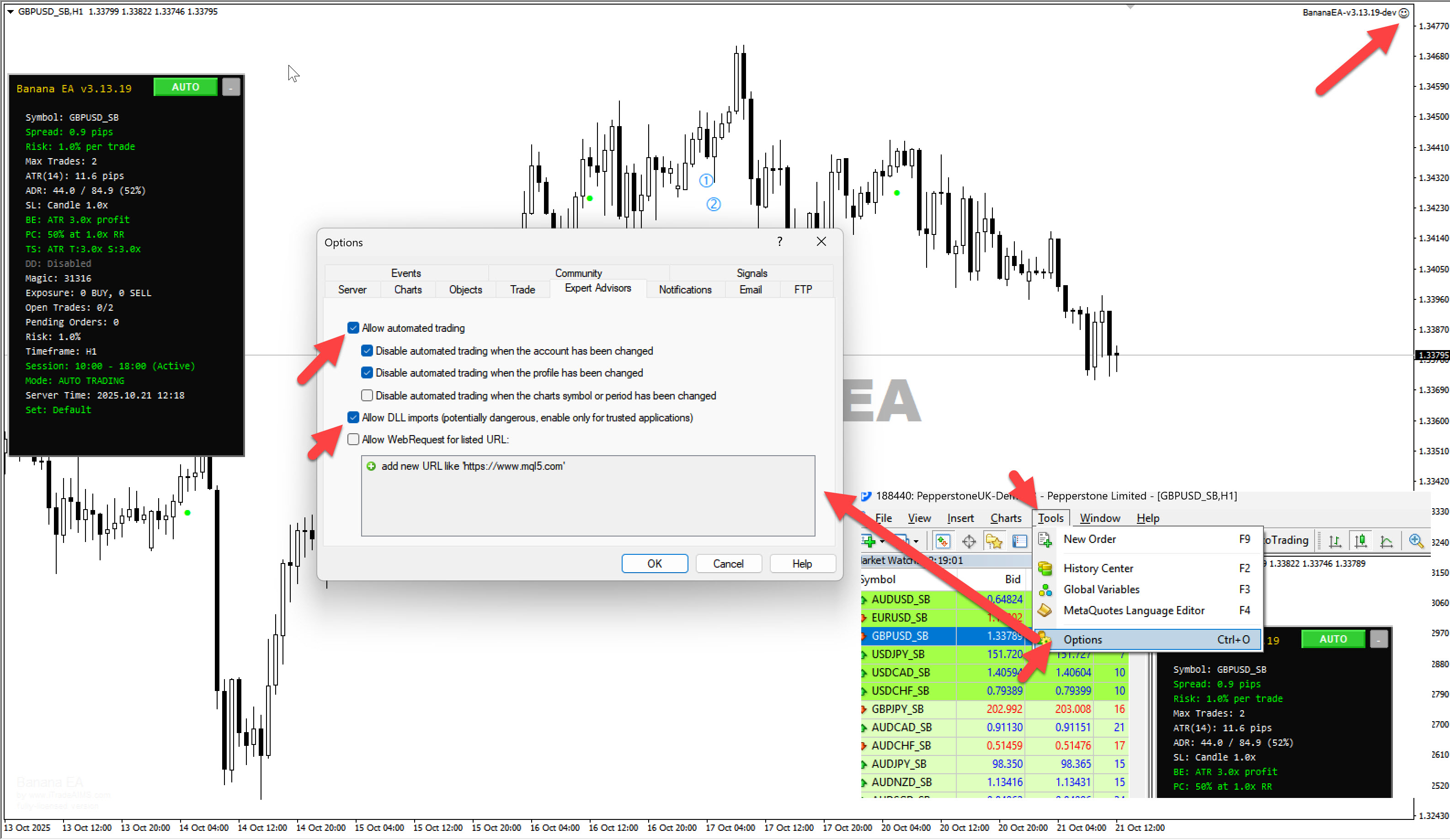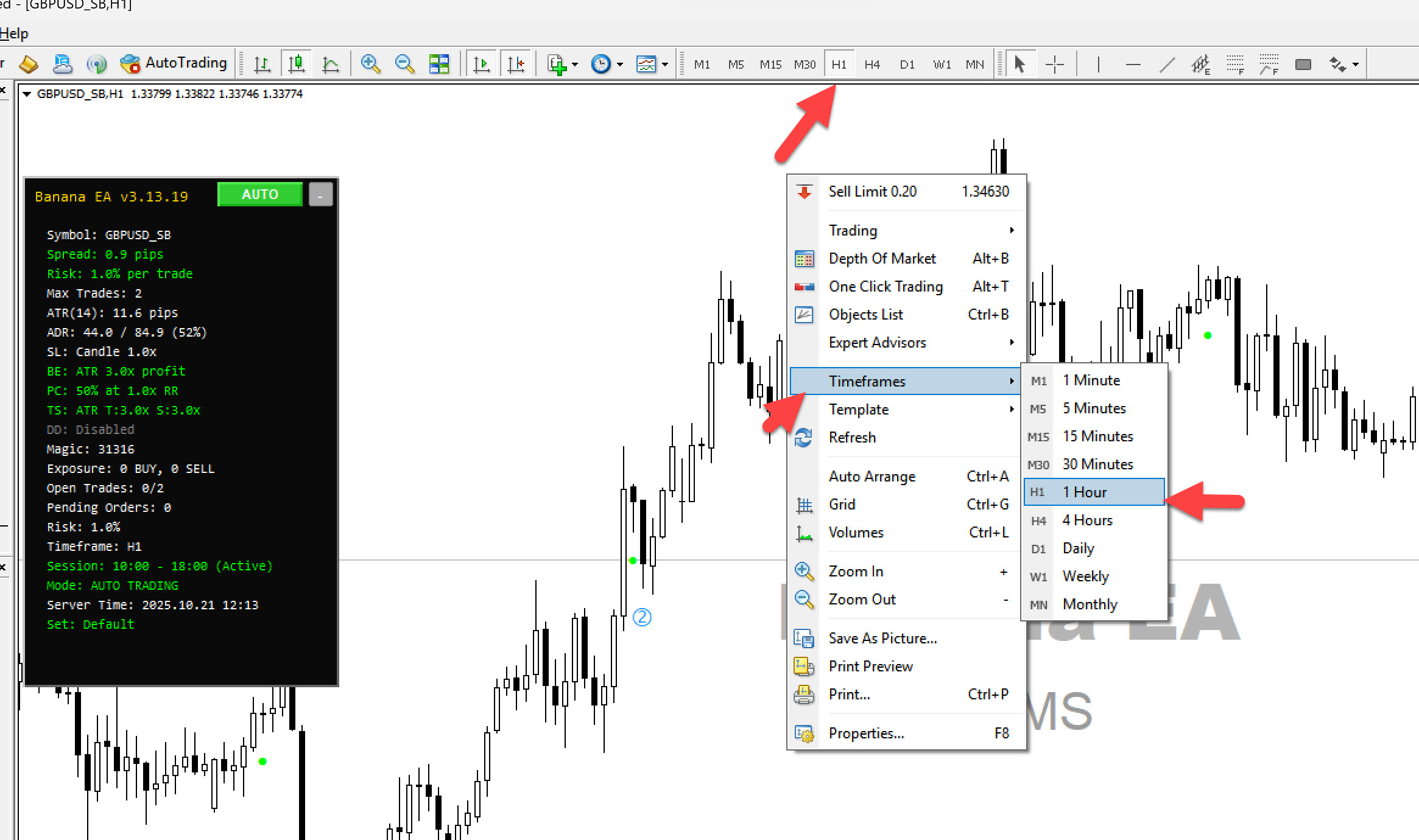 2. **EA name "BananaEA"** displayed on chart